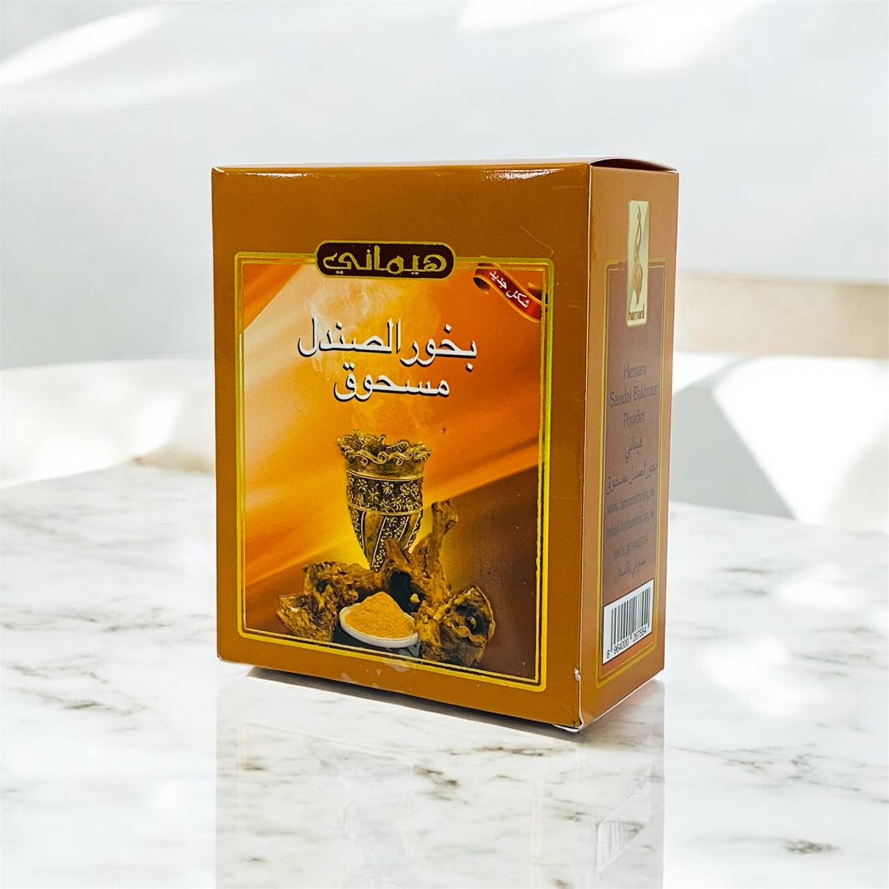 • أو كمكوّن مساعد يُخلط مع مواد أخرى (مستكة البخور – العود، العنبر، المسك، الورد…) في صناعة خلطات البخور الجاهزة.خشب الصندل معروف برائحته الثابتة والدافئة، وهو من أشهر المواد الطبيعية اللي يعتمدوا عليها صانعي البخور - هذا المنتج هو بخور الصندل المطحون (مسحوق) من نوع “هيماني”.