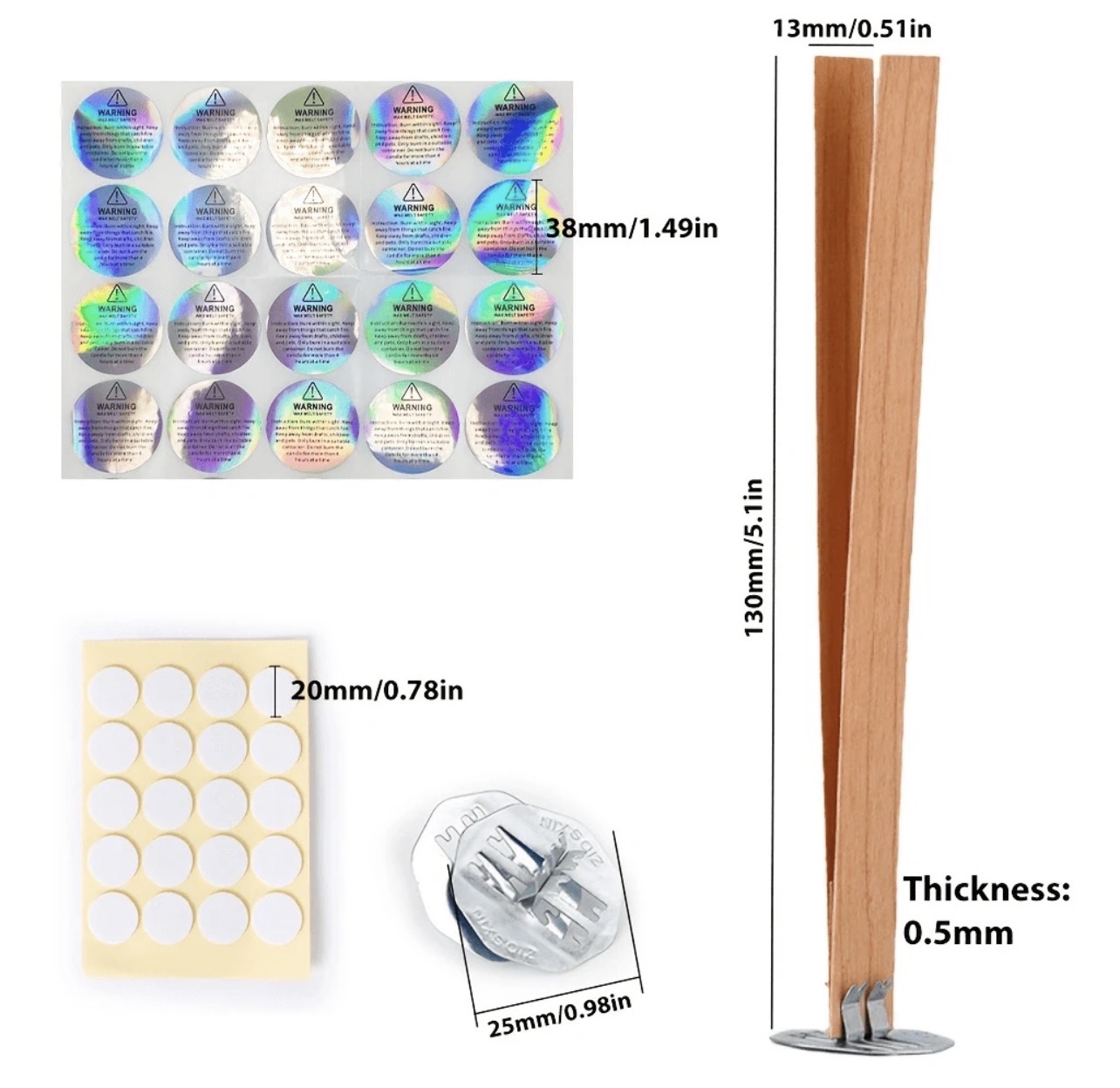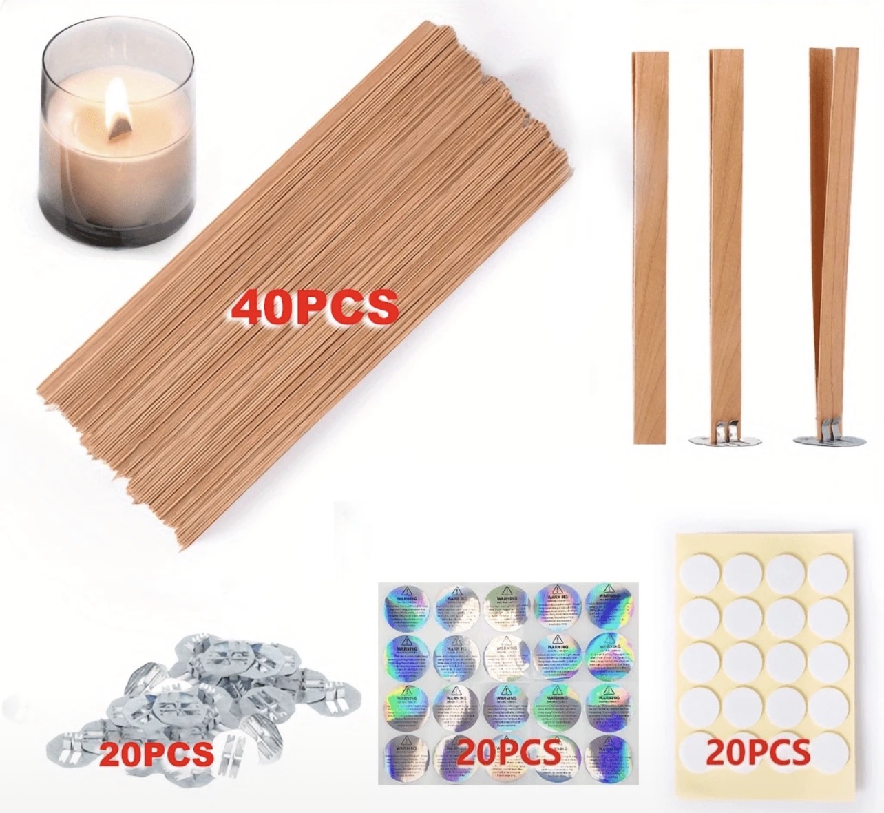 فتيل شمع خشبي 🪵 40 قطعة فتيل الخشب +20 قطعة معدنية +20 ملصق لتثبيت الفتيل +20 ملصق تحذير WFHM77